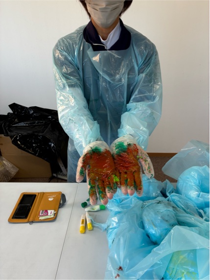 写真は、正しくPPFを脱ぐ際の場面です。絵具をエプロンにつけて。